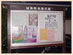 In addition to the clipboard that is passed from house to house, large community bulletin boards are placed in prominent places throughout the neighborhoods that post pertinent information for passersby to read. These include local notices, governmental campaigns and general information that residents may need to know regarding upcoming events and festivals.