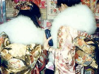 Two 20-year-old women who just celebrated Coming of Age Day, the second Monday in January, are shopping for mementos to mark the occasion. They are wearing fanciful mufflers around their necks to stay warm in the cold air. Submitted Photo